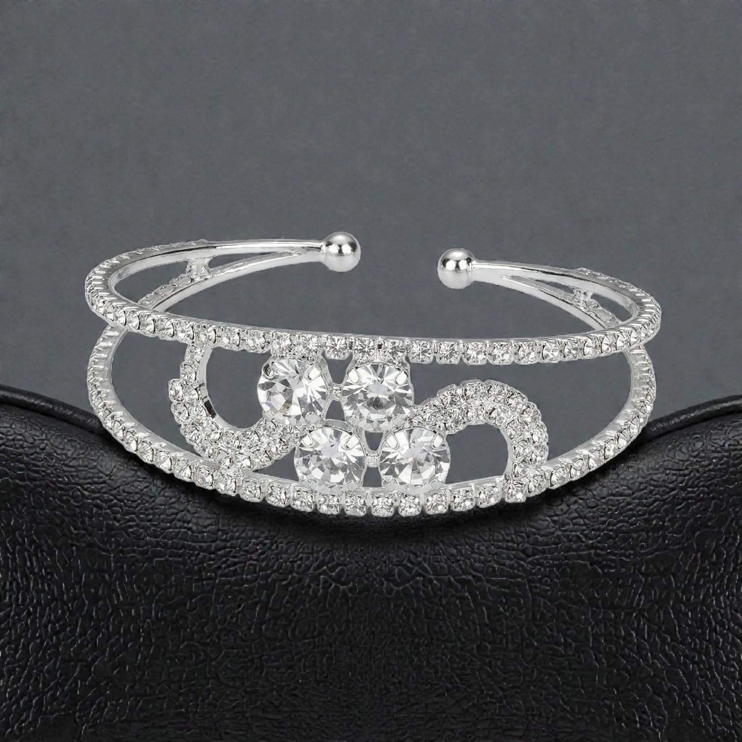 Part of the signature Lumina AD Collection, the Halo Bracelet is a celebration of brilliance, symmetry, and refined craftsmanship. This statement bracelet features meticulously set American Diamond stones arranged in an elegant royal cuff, designed to catch and reflect light with every movement.