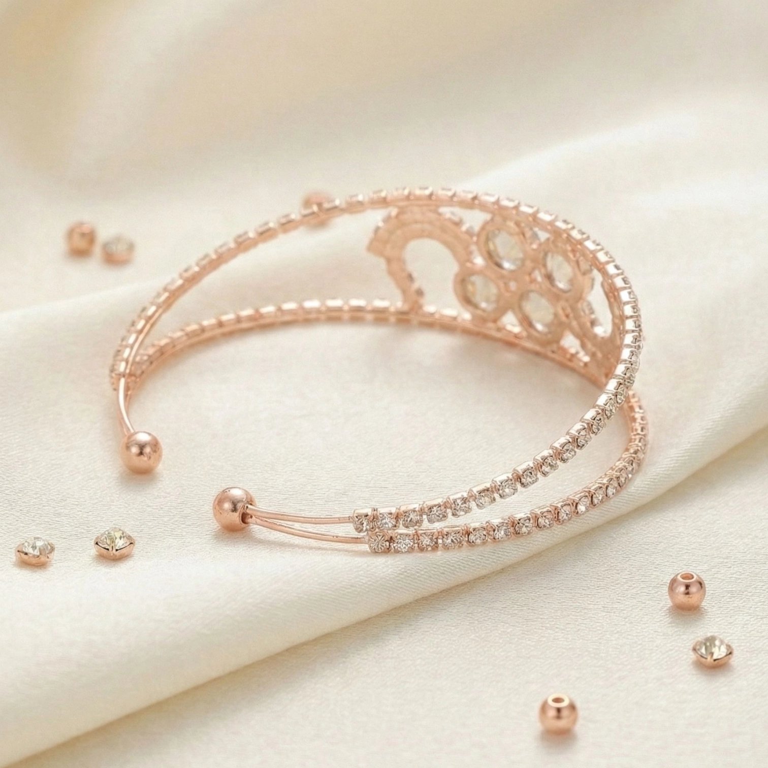 The bold kada silhouette adds structure and sophistication, while the intricate AD detailing brings a luxurious sparkle that elevates both ethnic and contemporary looks. Available in Rose Gold and Silver finishes, this bracelet is versatile enough for weddings, festive occasions, parties, and elegant evening wear.
