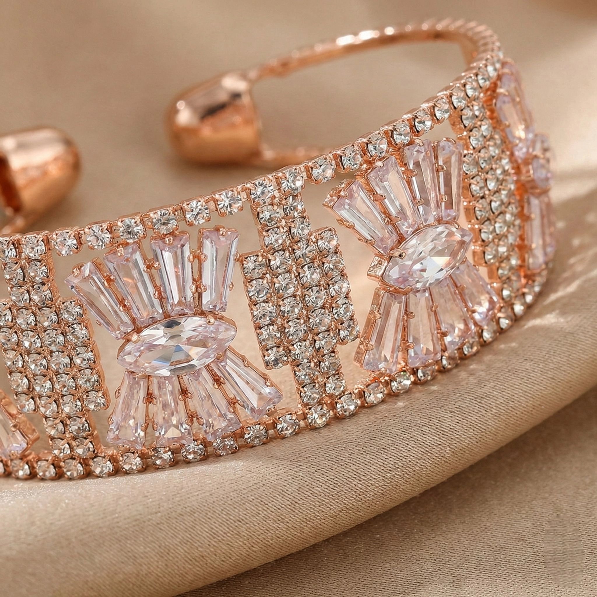 The bold kada silhouette adds structure and sophistication, while the intricate AD detailing brings a luxurious sparkle that elevates both ethnic and contemporary looks. Available in Rose Gold and Silver finishes, this bracelet is versatile enough for weddings, festive occasions, parties, and elegant evening wear.
