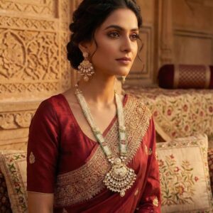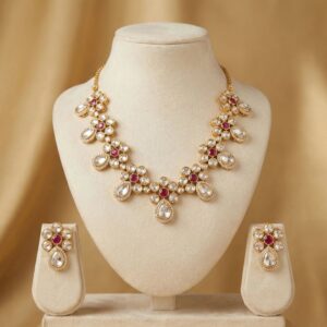Elevate your style with this regal accessory, perfect for special occasions and enhancing your ensemble with an opulent touch. Shop now and indulge in the timeless elegance of our Semi precious collection. The stone work in the necklace set adds a sign of elegance statement to your look.
