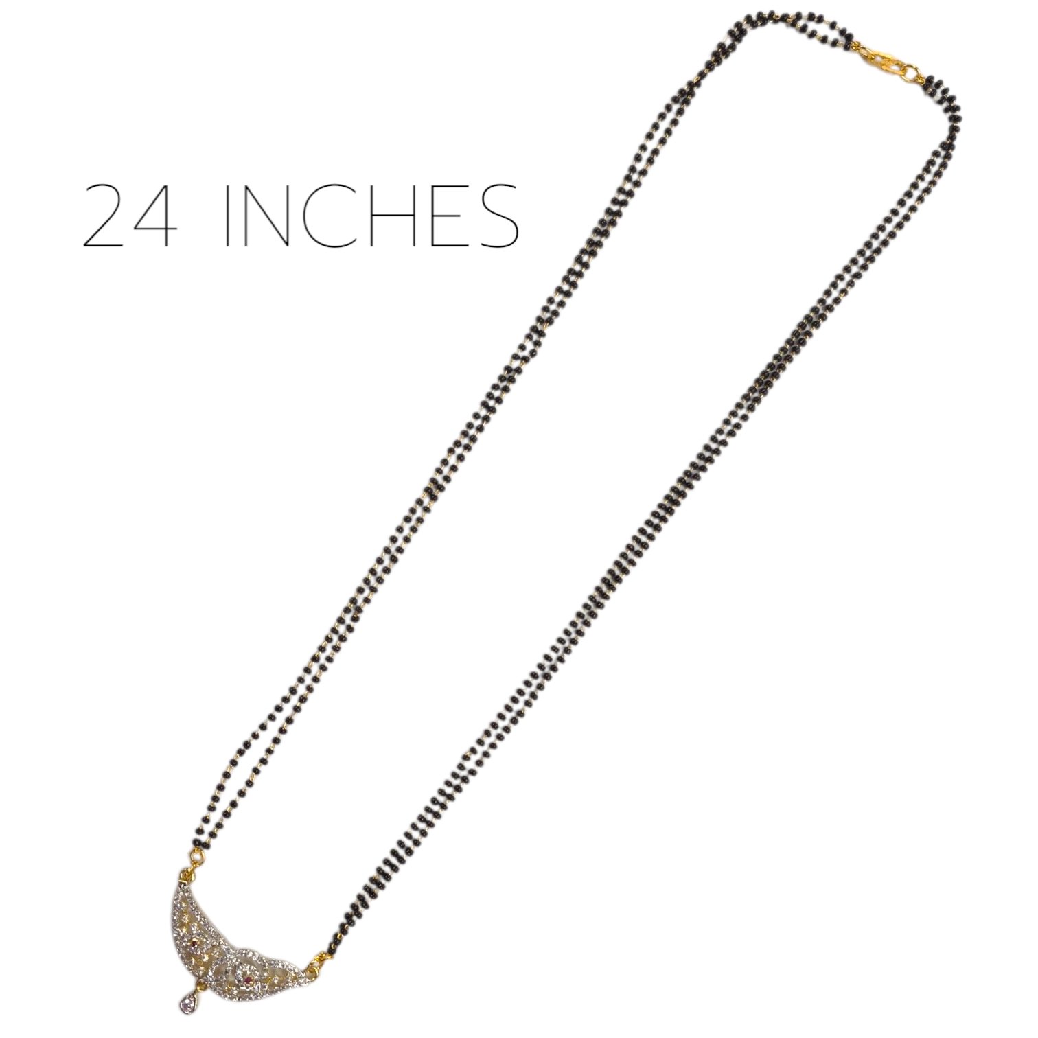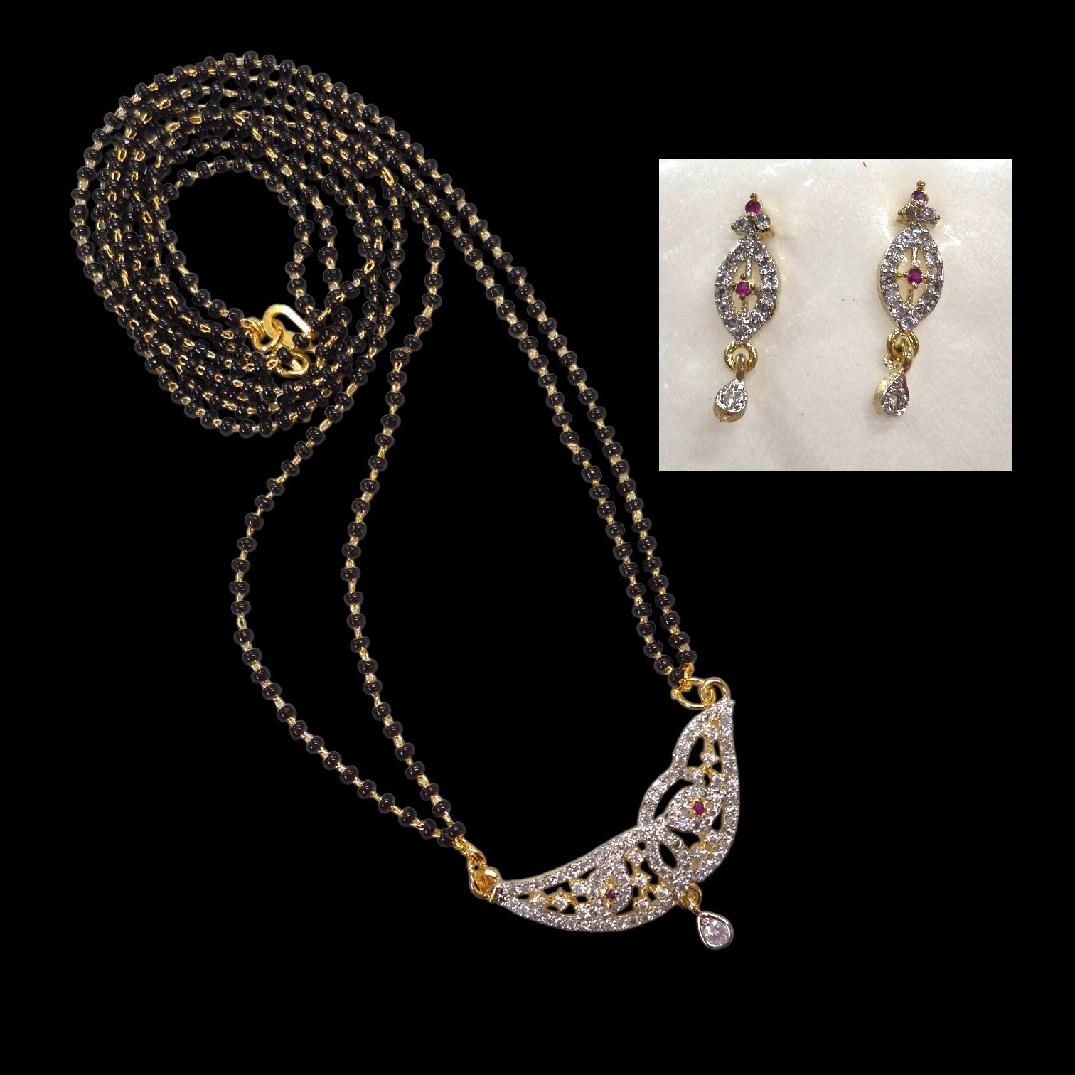Elevate your ethnic ensemble with this exquisite AD Mangal sutra. Inspired by timeless Gold jewelry, this AD pendant with black Mangal sutra chain and matching earrings showcases intricate detailing, reflecting the skilled artistry .
