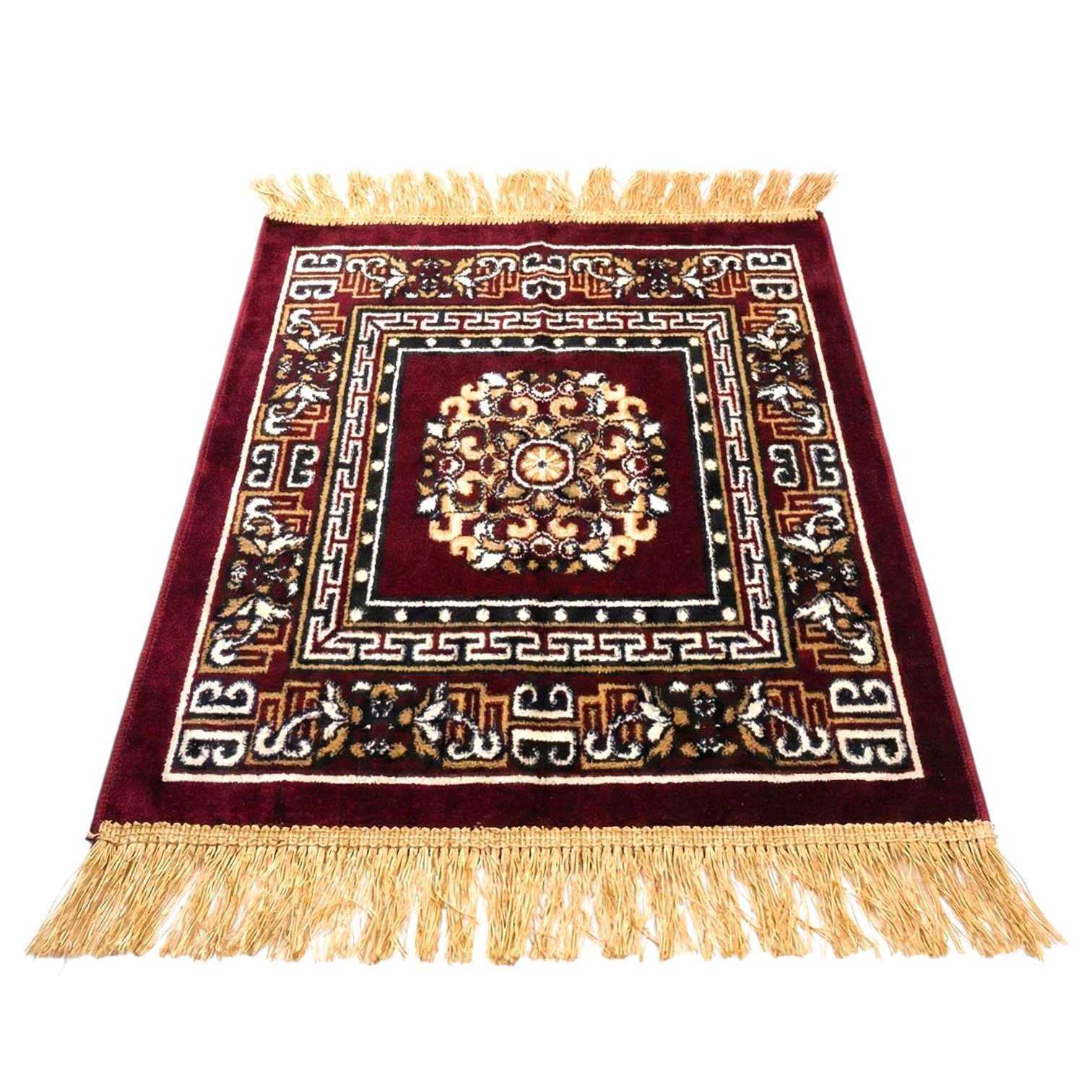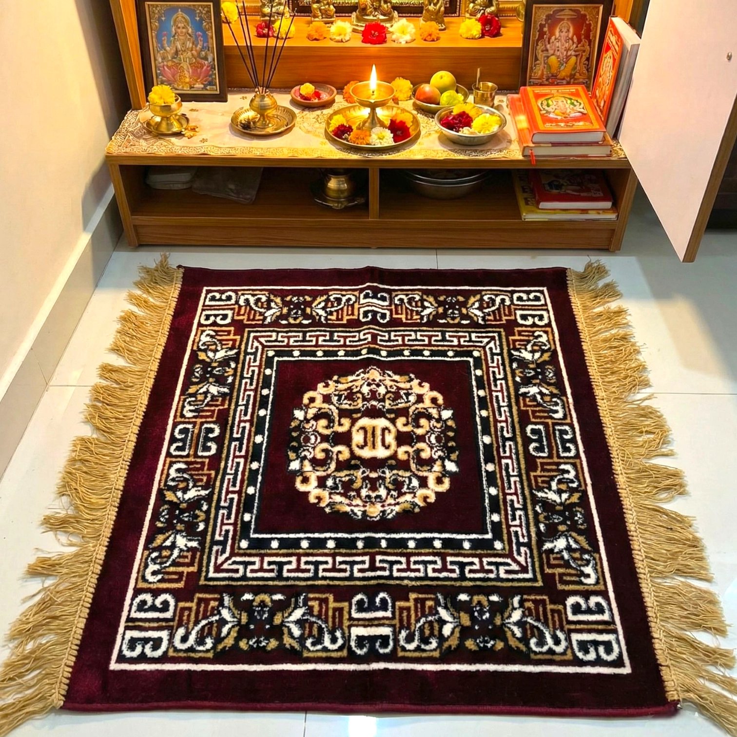 The 24″x24″ size makes this rug an ideal companion for small spaces, meditation corners, or prayer areas. Its compact dimensions ensure easy placement without compromising the luxurious feel.