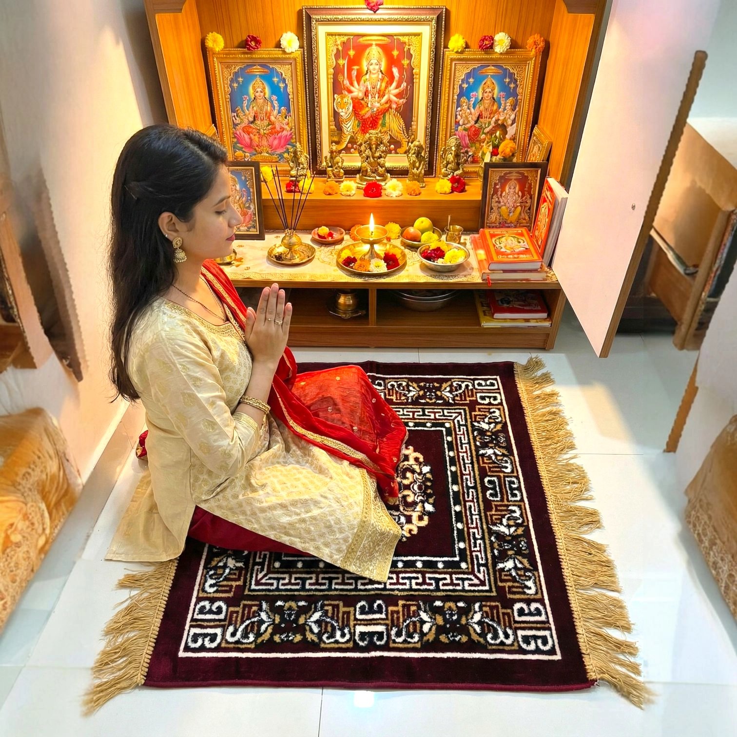 Elevate your meditation and prayer rituals with our velvet hand-stitched rug, designed to provide exceptional comfort and elegance. Made from premium velvet, this rug embodies both durability and softness, perfect for enhancing your spiritual experience.