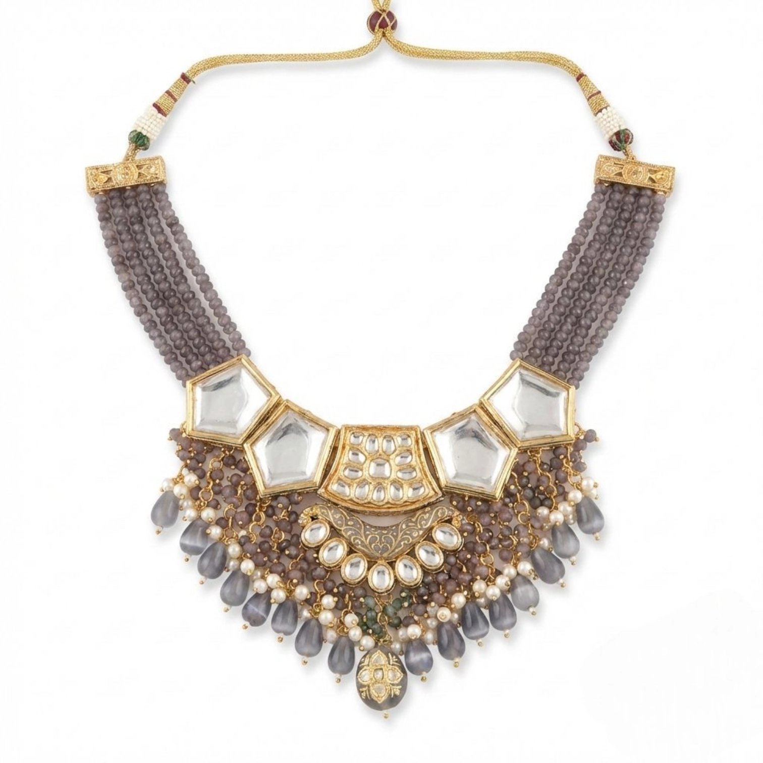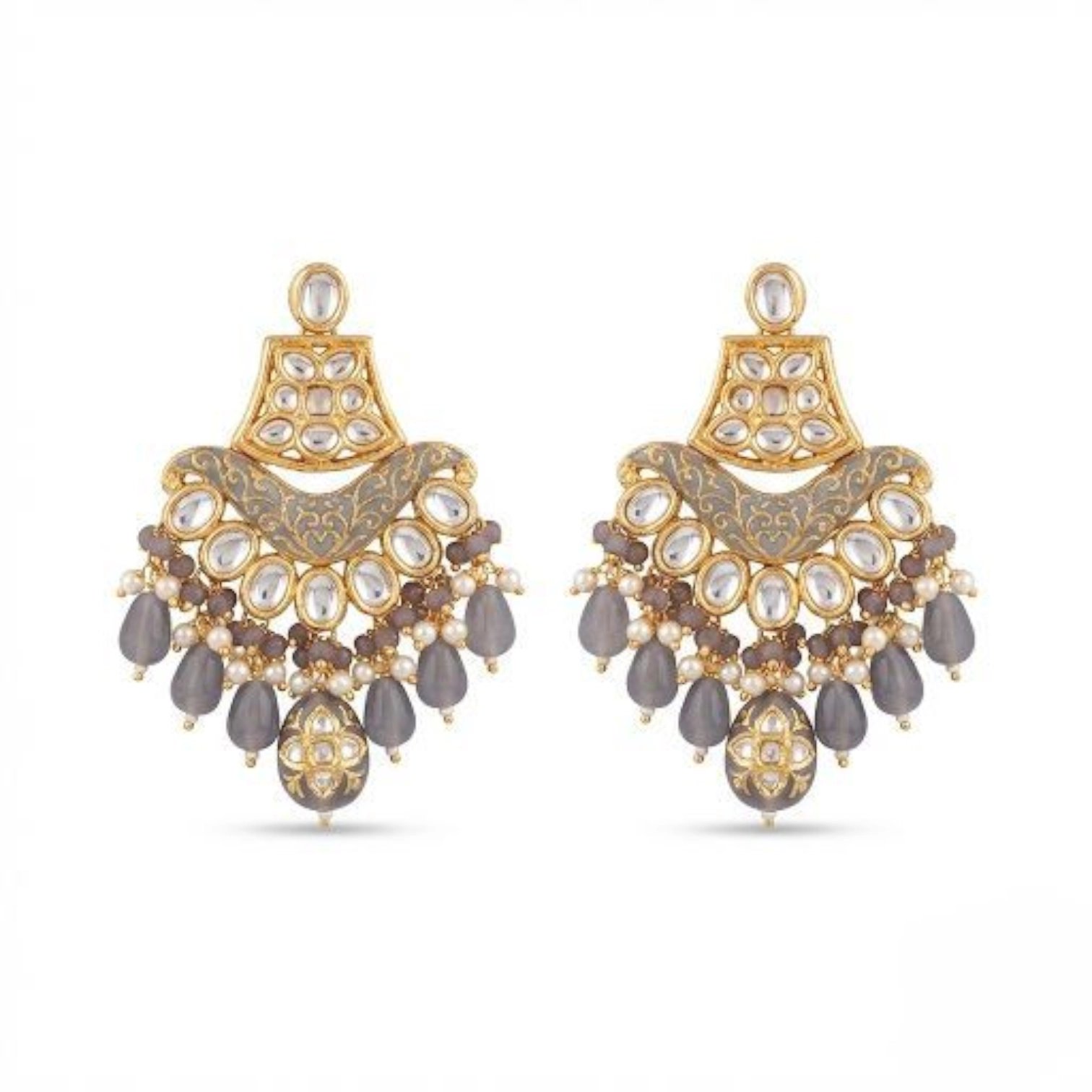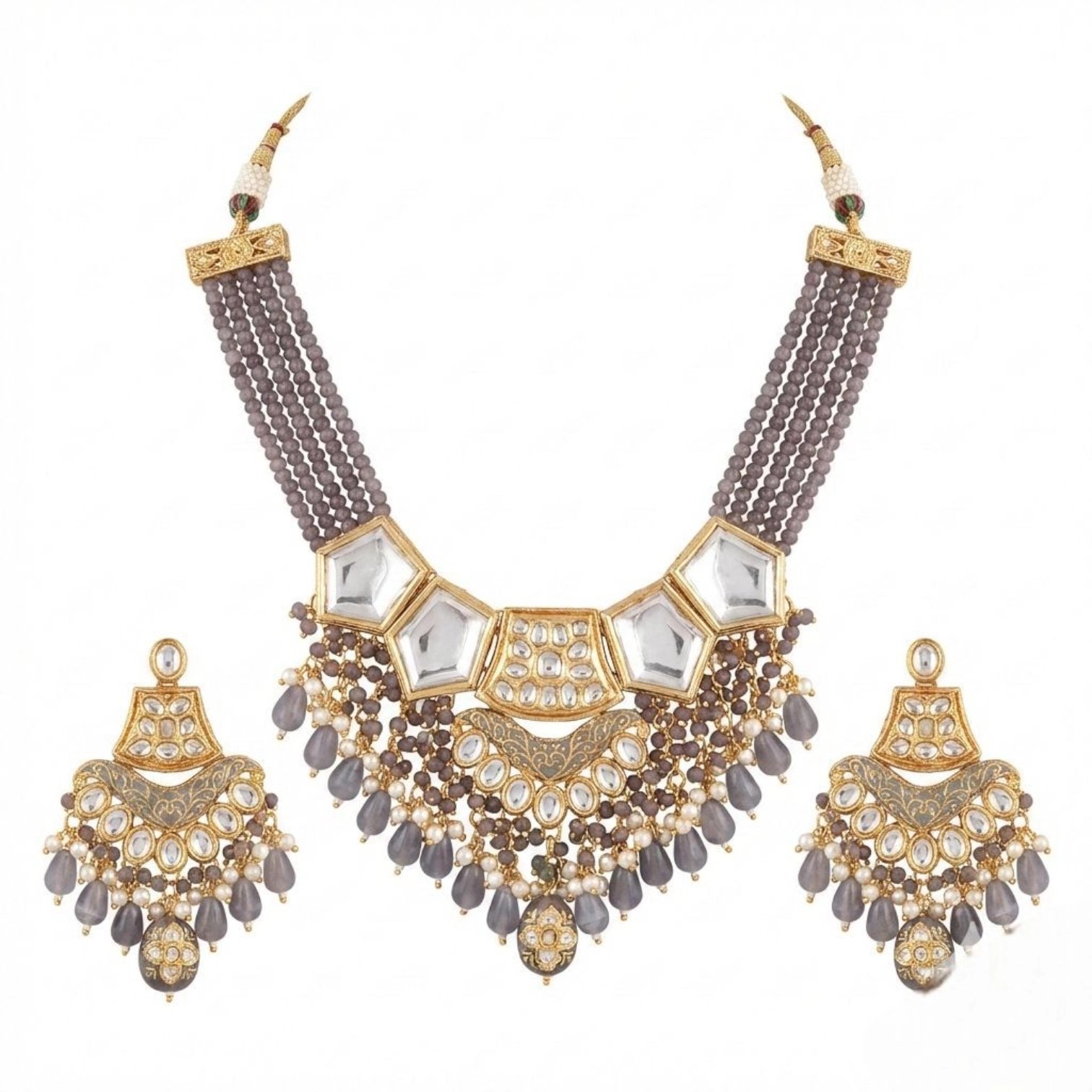 Discover the exquisite charm of our Premium kundan stone Necklace and Earring Set. This stunning jewelry ensemble features a captivating design with intricate detailing of brown & grey beads, adorned with a 24k gold plating.