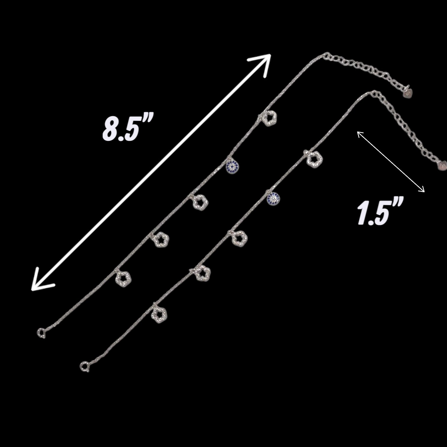 Close up of the charms on the 925 sterling silver anklets – Pair of Silver anklet bracelets