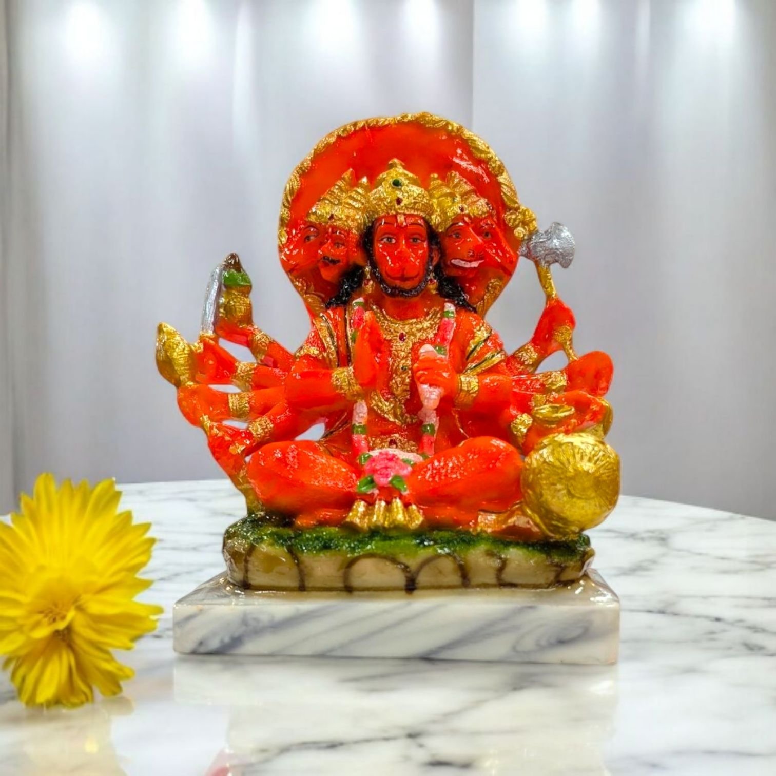 Meticulously made from high-quality poly stone, this statue captures the intricate details of each of the five faces—Hanuman, Narasimha, Garuda, Varaha, and Hayagriva—with remarkable clarity. The sturdy poly stone material ensures durability and a premium, stone-like finish that will stand the test of time.