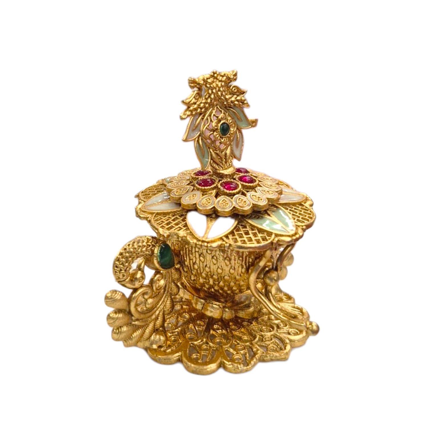 Infuse your sacred rituals with the elegance and symbolism of the divine peacock through this exquisite Peacock Themed Kumkum Box. A celebration of beauty, spirituality, and masterful artistry, this piece is designed to be a stunning centerpiece for your puja altar.
