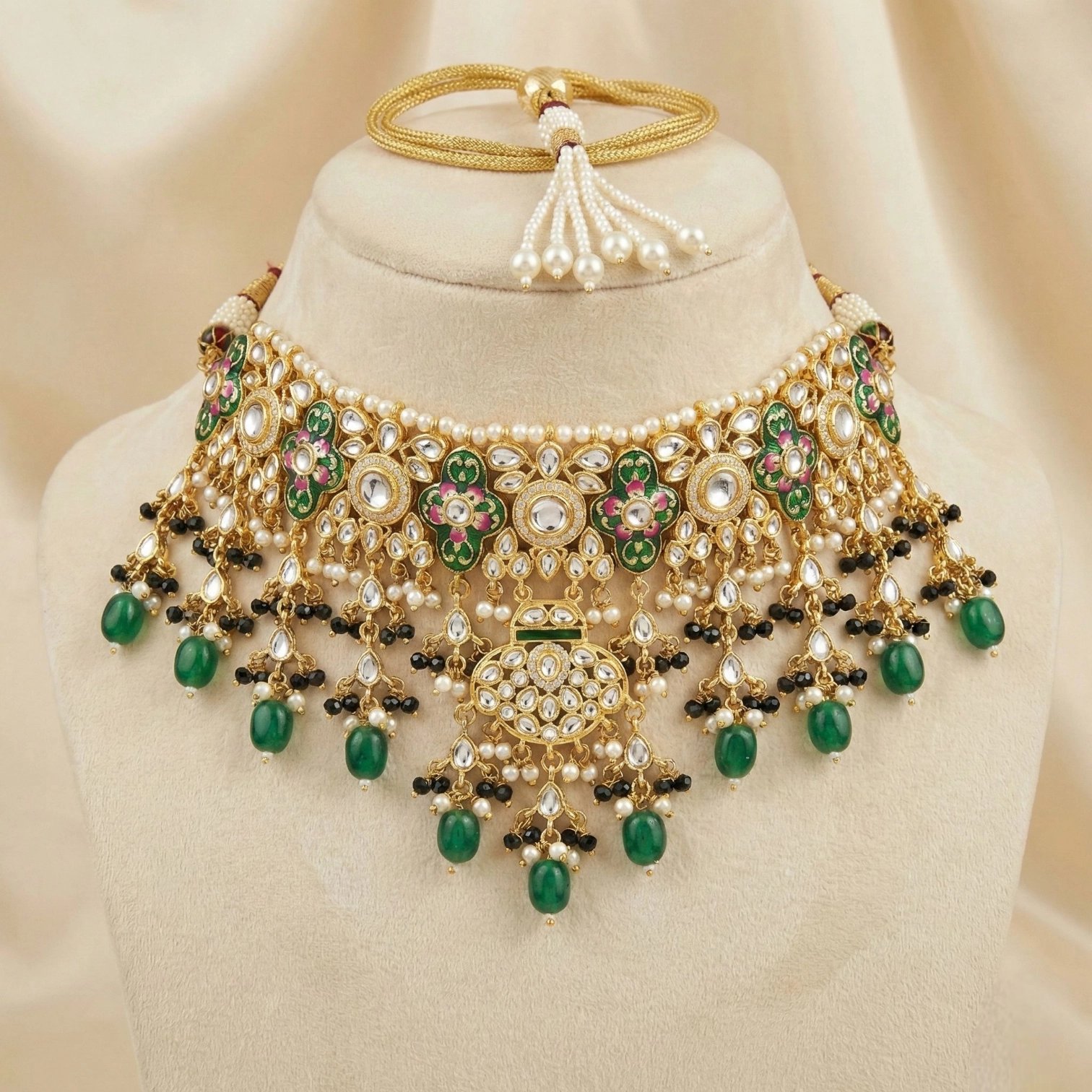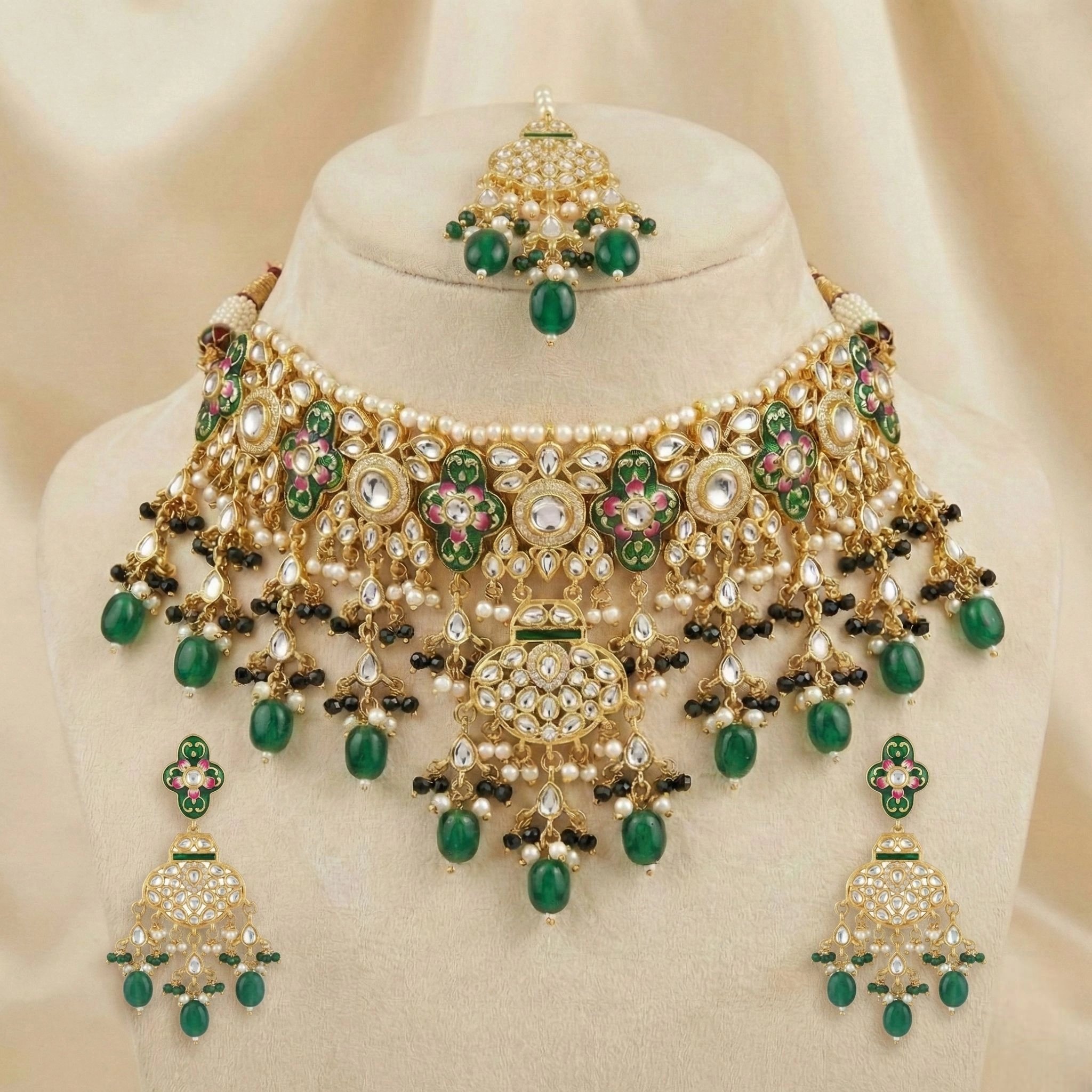 Handcrafted with intricate studded Kundan stone work, this bridal choker set reflects heritage craftsmanship and regal charm. The structured choker design enhances the neckline, making it perfect for brides, bridesmaids, wedding guests, and festive occasions.