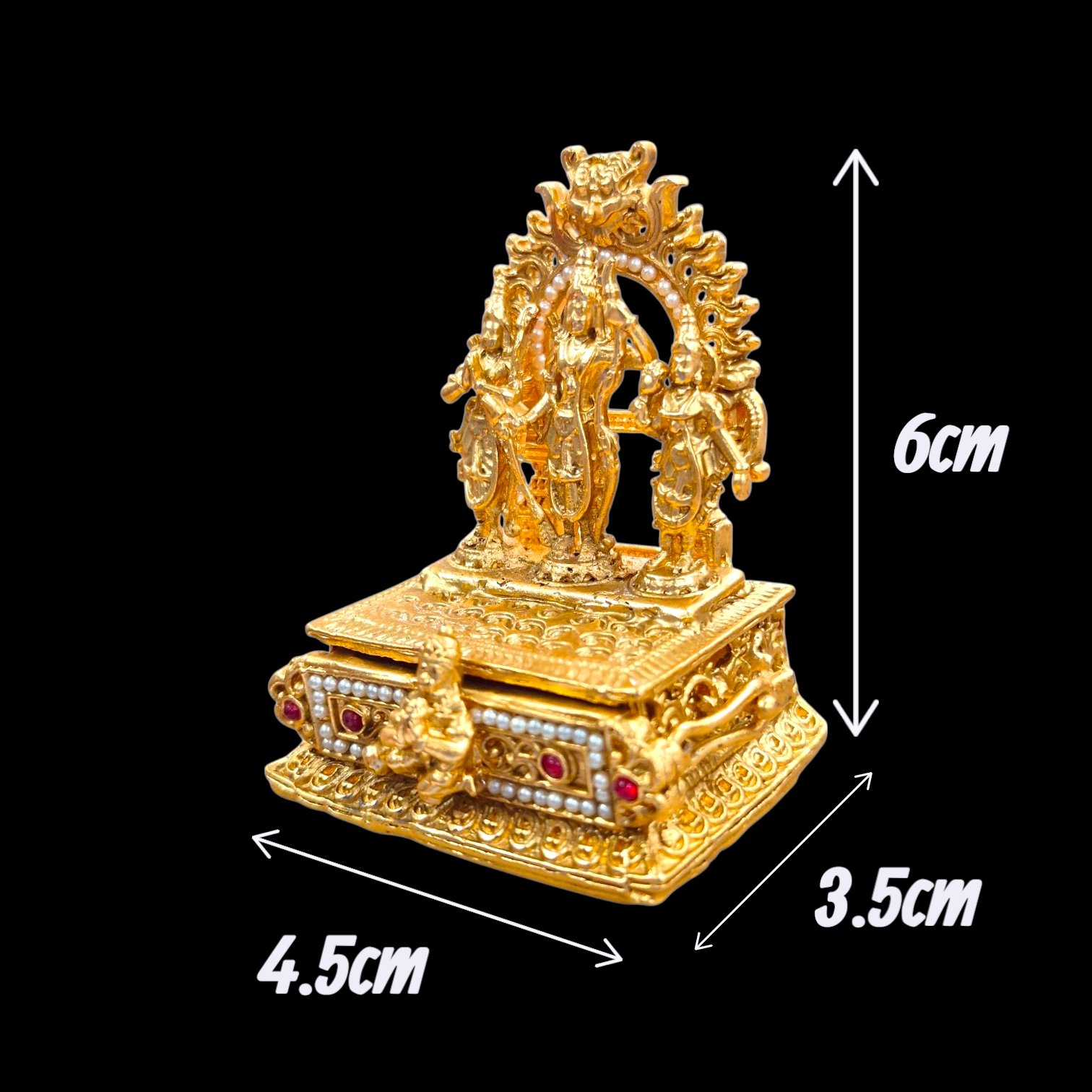 The focal point is the beautifully detailed depiction of the Ram Darbar on the lid, capturing the serene majesty of Lord Ram, the devotion of Mata Sita, the loyalty of Lakshman, and the unwavering dedication of Lord Hanuman. This divine ensemble serves as a constant reminder of righteousness, devotion, and familial unity.