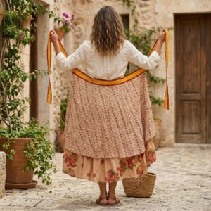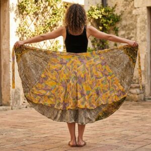 Two-layer silk sari wrap skirts are versatile, reversible garments handcrafted from upcycled vintage saris, meaning each piece is one-of-a-kind. These “magic skirts” typically feature two distinct layers of fabric and can be worn in multiple ways, including as a skirt, dress, or beach cover-up