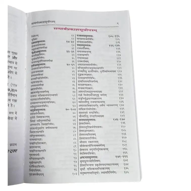 Written in a clear and logical style, Satyarth Prakash critically examines religious beliefs, rituals, and superstitions, encouraging readers to seek knowledge through reason, ethics, and the teachings of the Vedas. The book addresses key subjects such as the nature of God, the soul, karma, rebirth, education, morality, and social responsibilities, making it both a spiritual and intellectual guide.