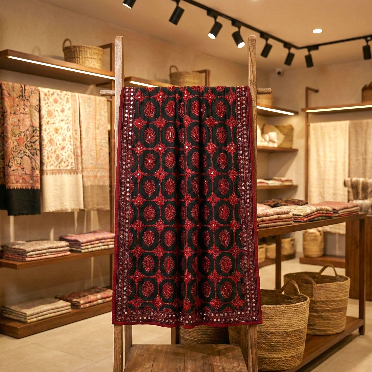 Generously sized at 32 x 84 inches, it can be styled in multiple ways—draped over the shoulders, wrapped as a shawl, or layered with your favorite ethnic outfits. Whether paired with evening wear or everyday ensembles, this faux phulkari stole brings warmth, sophistication, and timeless charm to your wardrobe.