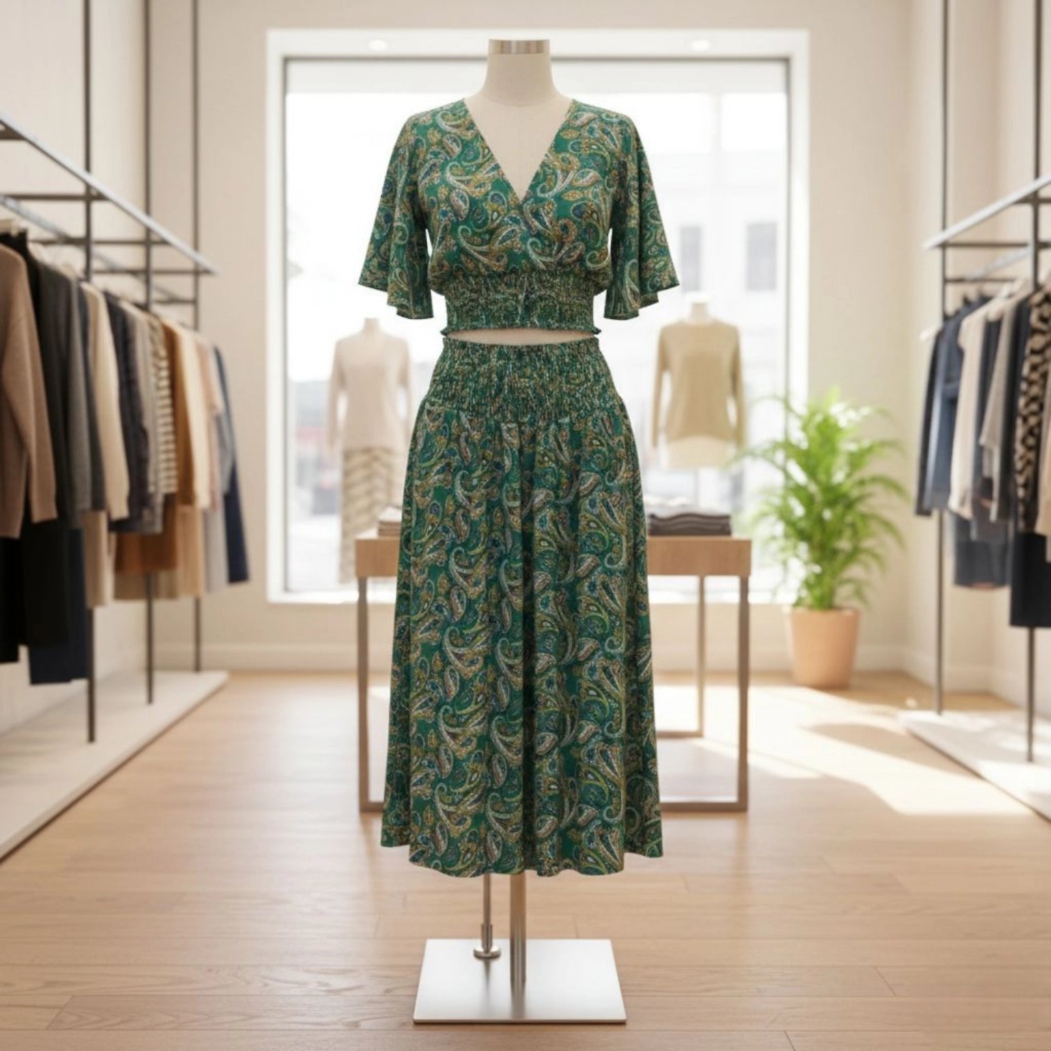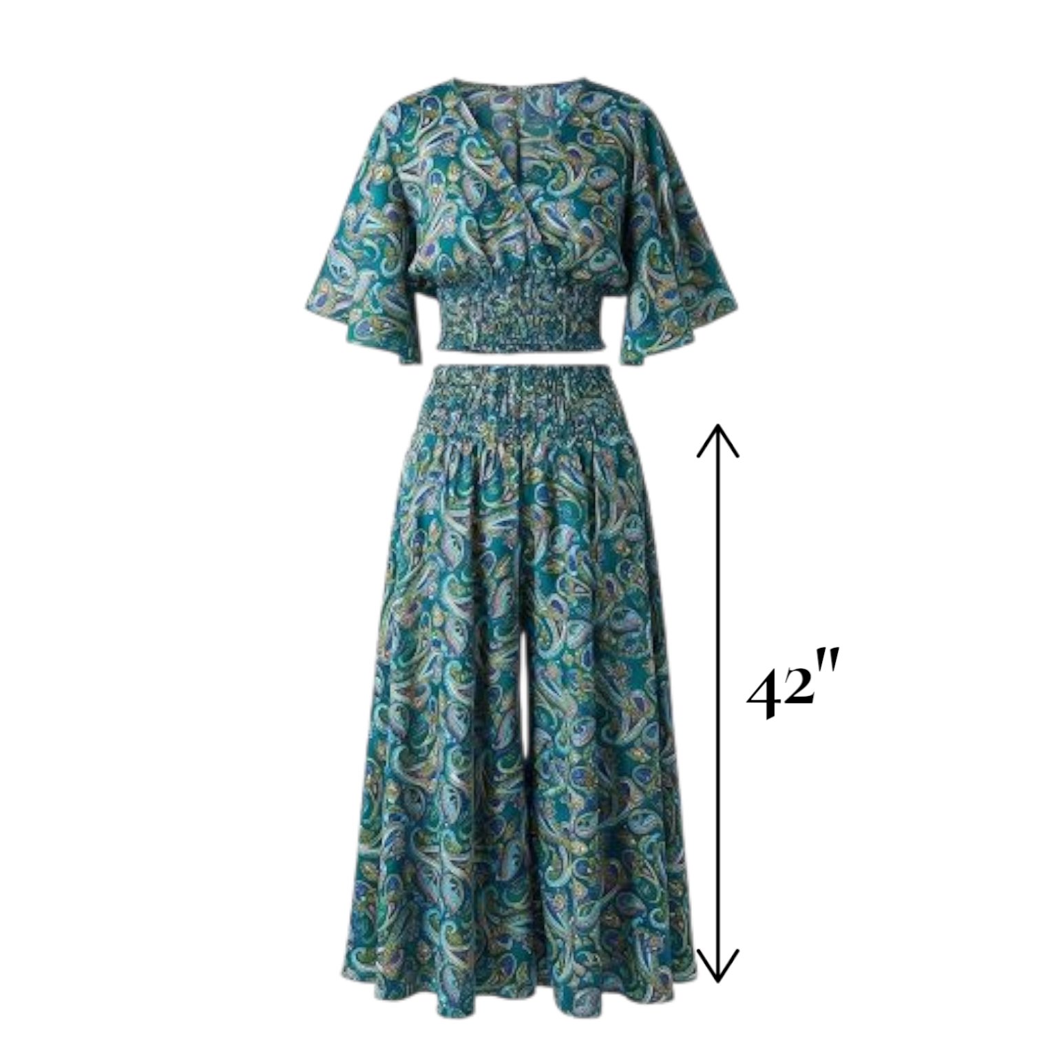 Silk V-Neck Top with Palazzo Crop Set – Green