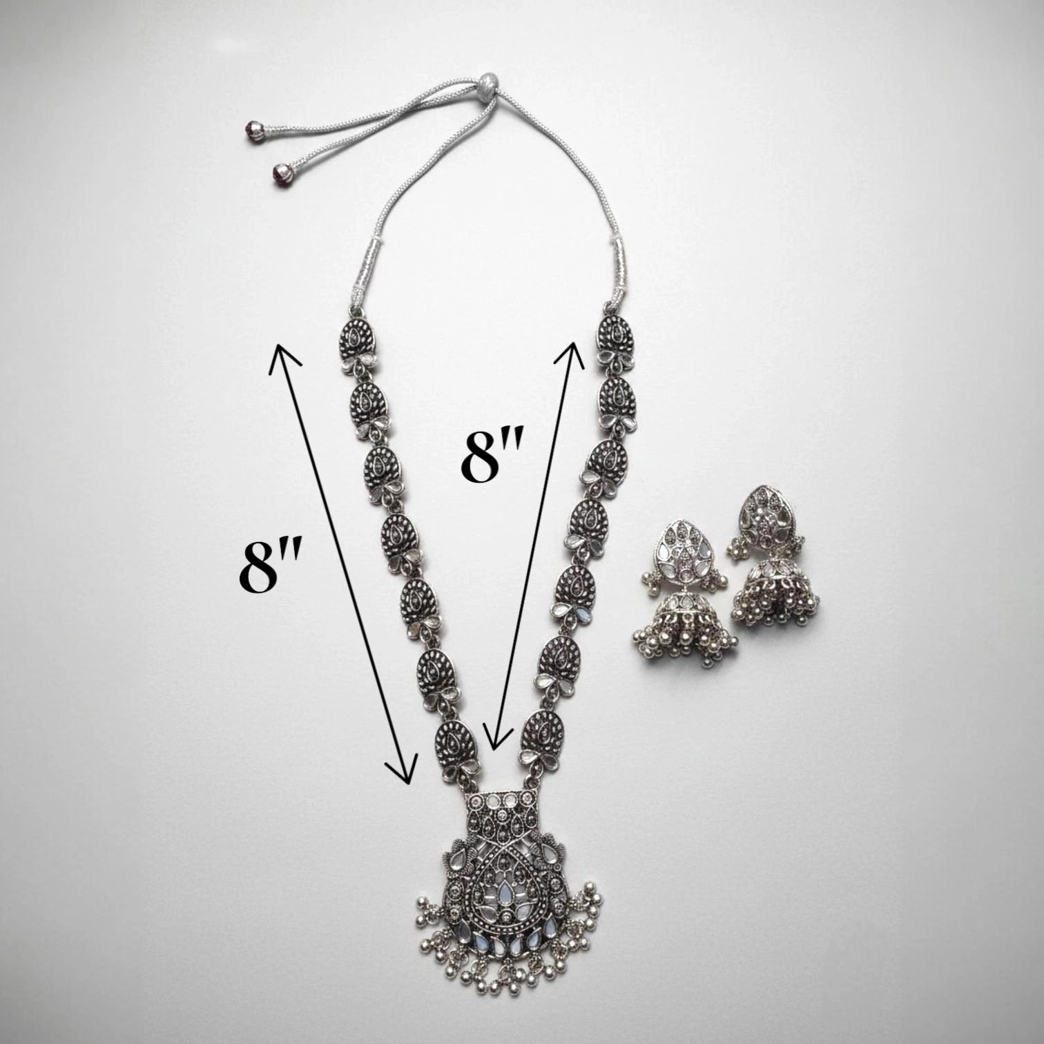 Designed in a luxurious antique silver finish, the necklace showcases intricate detailing with kundan stones, making it a striking statement piece. The coordinated earrings enhance the regal look, making this set ideal for weddings, bridal wear, festive celebrations, pujas, and classical performances.