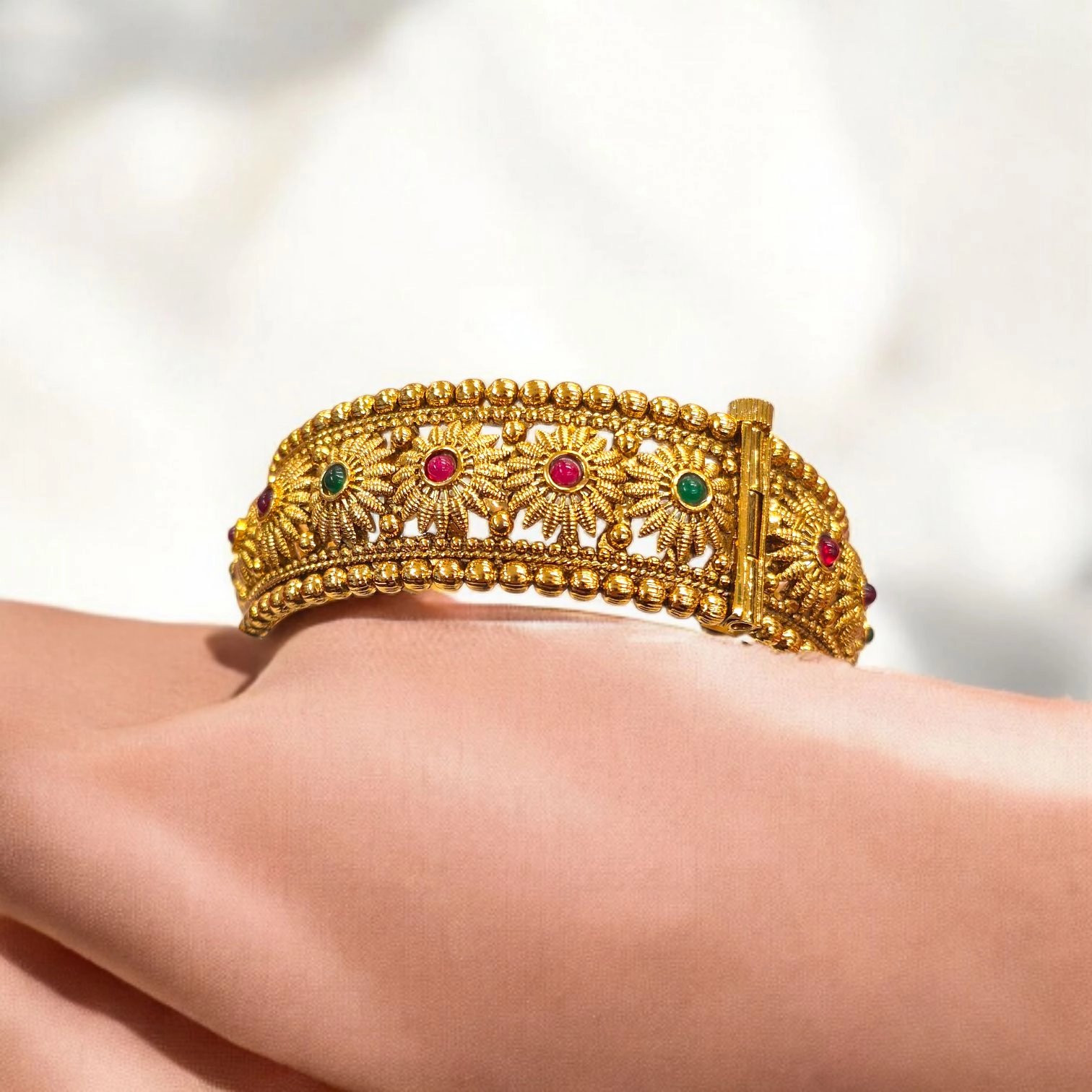 Designed to be worn as a statement cuff or traditional kada, its openable adjustable structure ensures a comfortable fit for most wrist sizes. The deep green and ruby-red stone accents add a regal touch, making it a perfect match for sarees, lehengas, Anarkalis, and Indo-western ensembles.