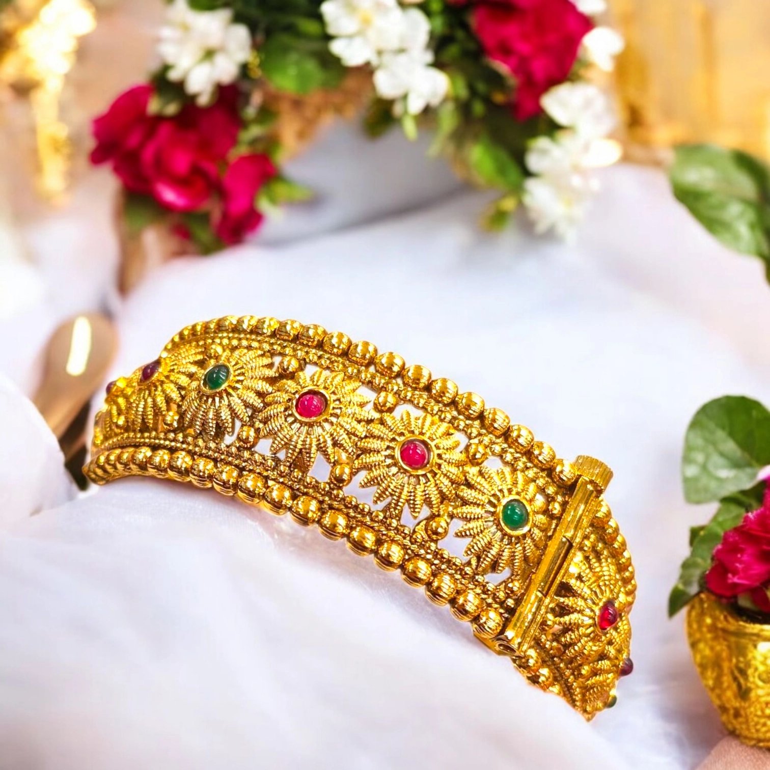 Whether styled for weddings, festive celebrations, temple visits, or elegant everyday wear, the Swarnika anmol bracelet Cuff brings understated luxury and cultural richness—making it a cherished piece.