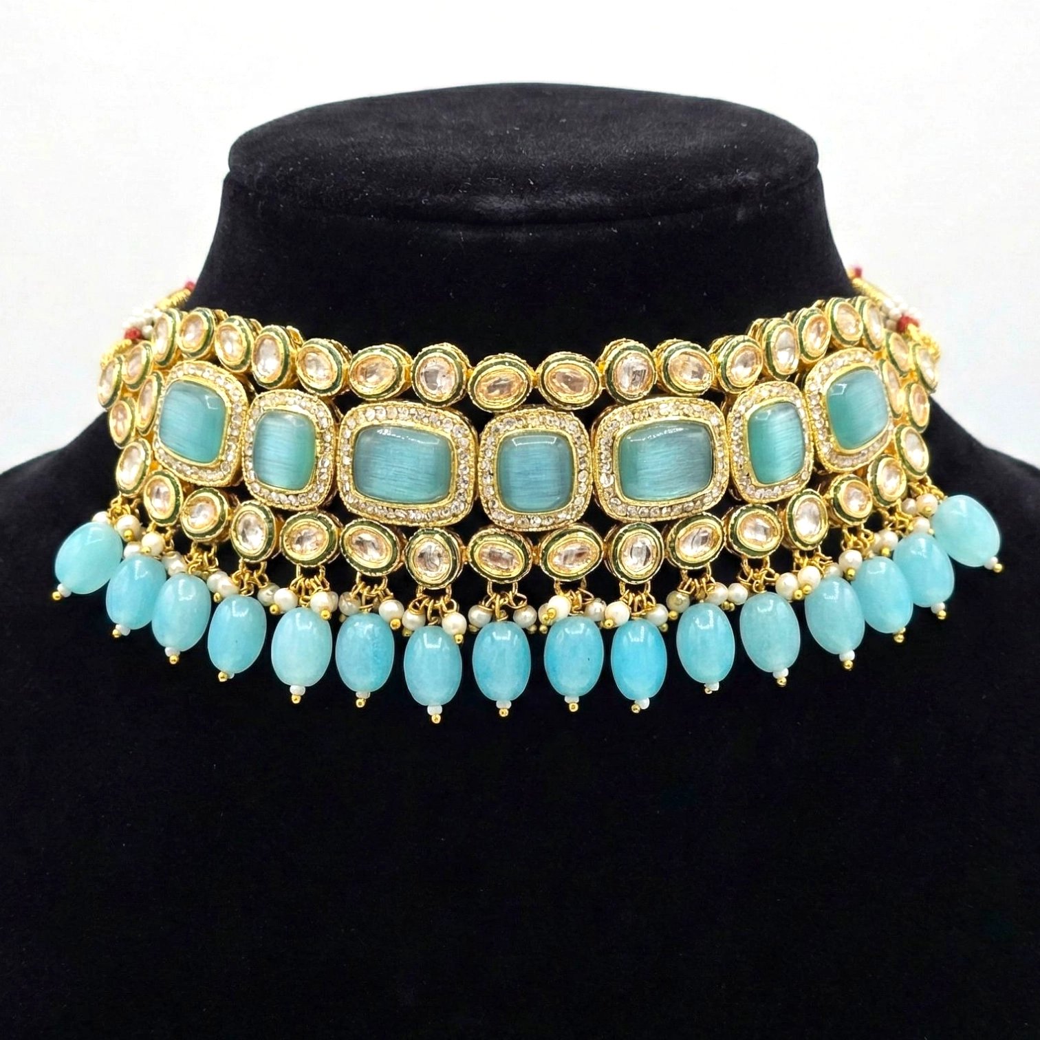 Radiate timeless sophistication with the Emerald Dew – Turquoise Kundan Choker Set, beautifully designed in a bright tones for a chic, modern-traditional look. This luxurious Kundan choker necklace set features: