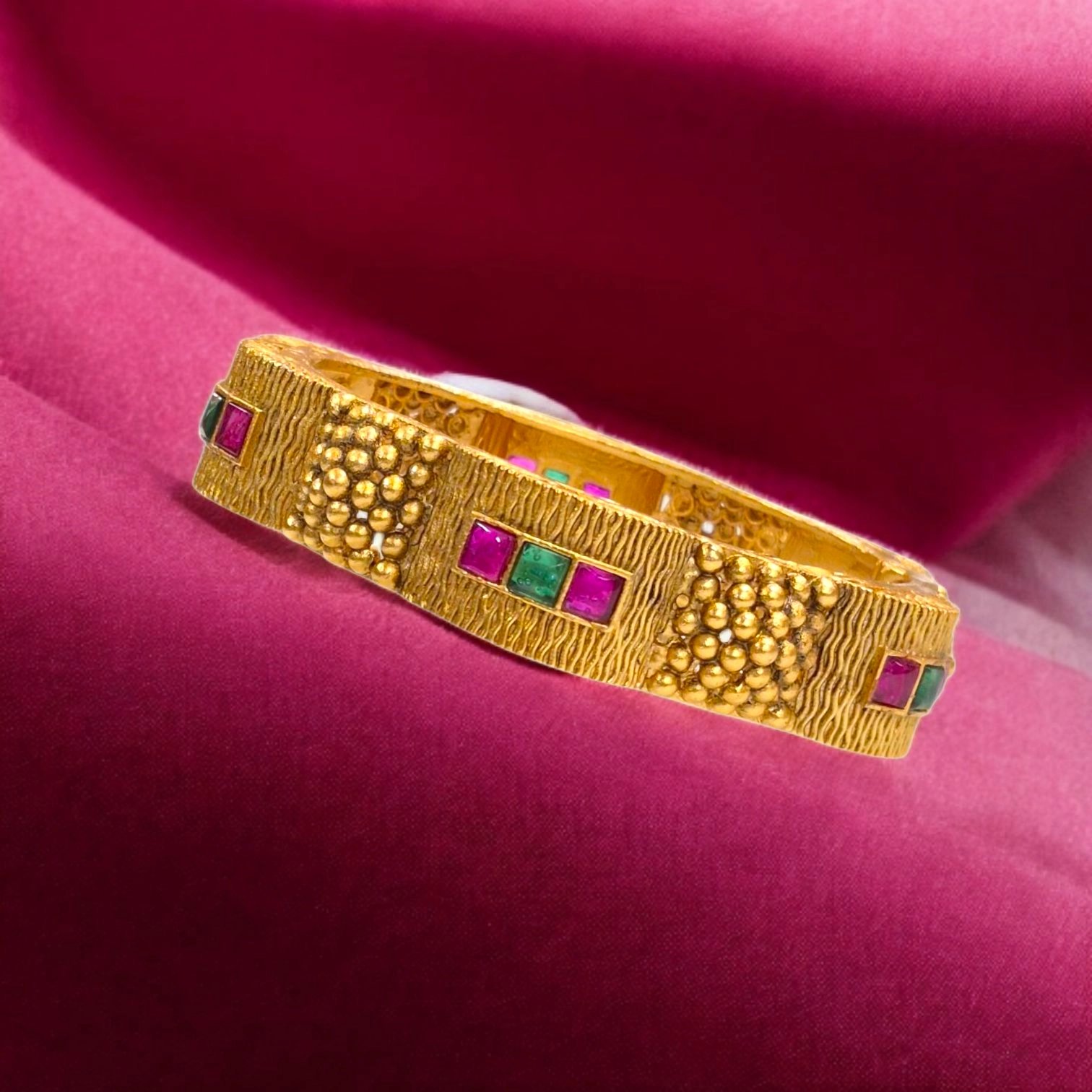 Designed to be worn as a statement cuff or traditional kada, its openable adjustable structure ensures a comfortable fit for most wrist sizes. The deep green and ruby-red stone accents add a regal touch, making it a perfect match for sarees, lehengas, Anarkalis, and Indo-western ensembles.