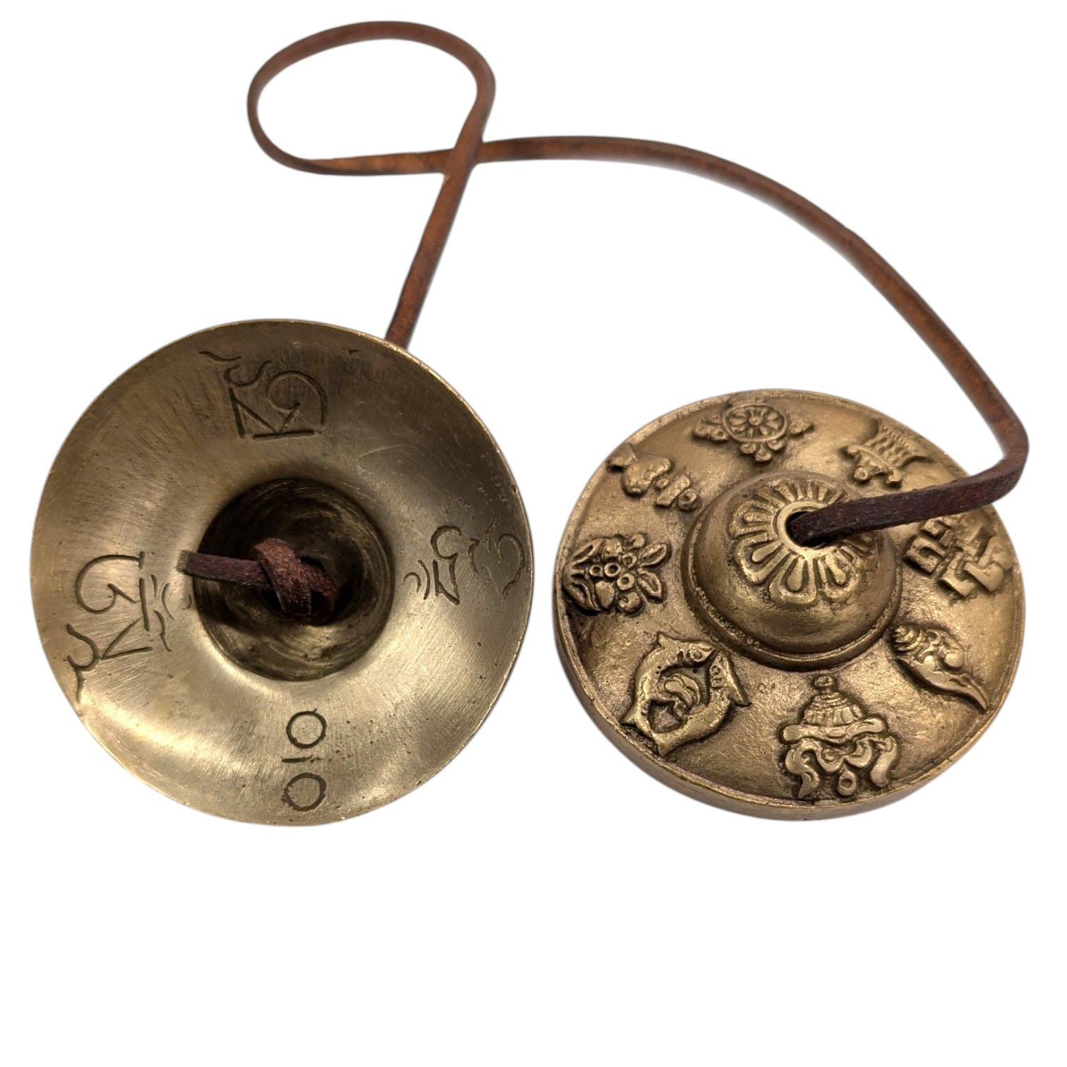 Immerse yourself in the serene sounds and spiritual significance of the Tingsha bell from India, adorned with the sacred Buddhist symbols. Explore its soothing vibrations and compact 6.7 cm diameter, perfect for meditation and mindfulness practices. These are also known as Manjira / Manjeera.