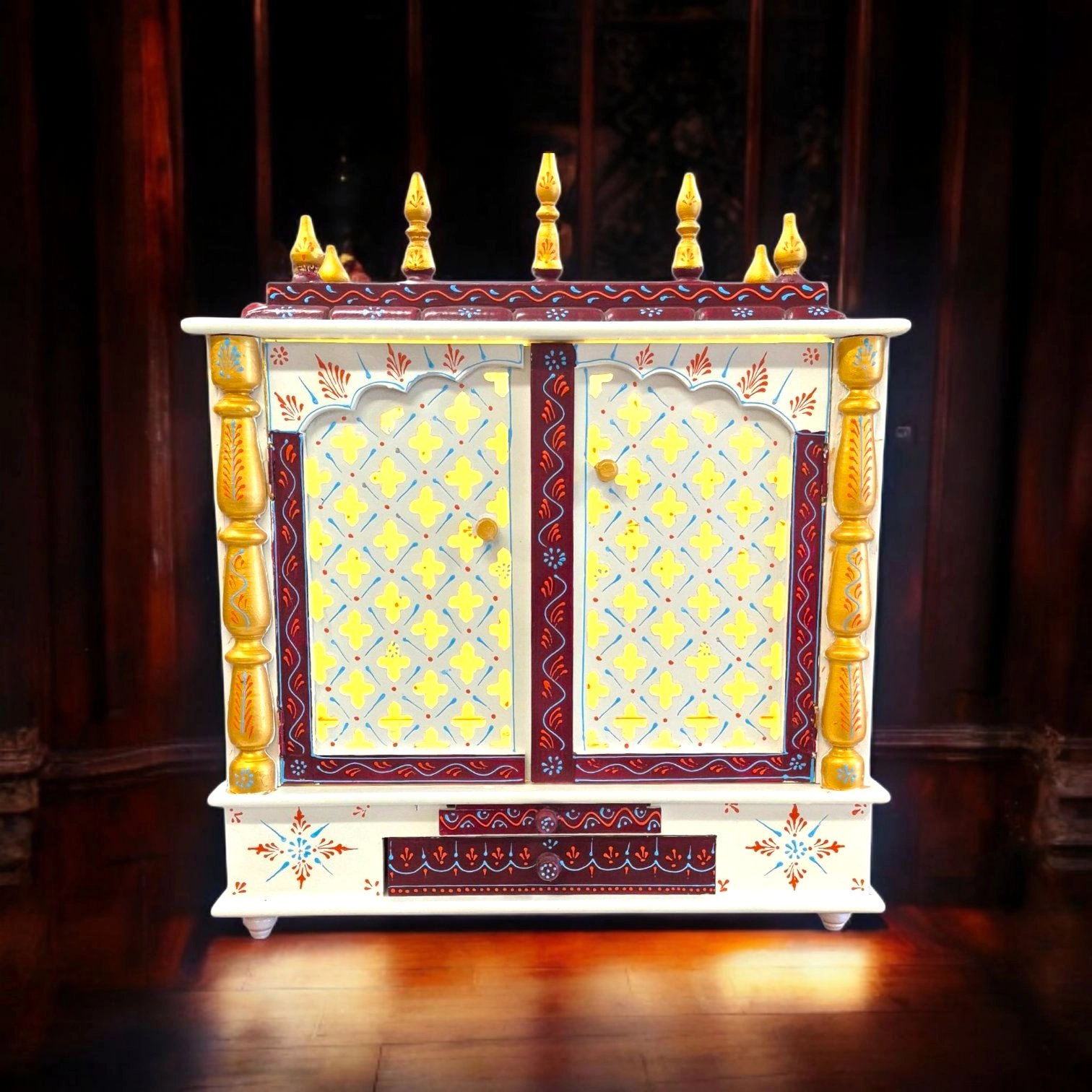 Its compact yet ample size makes it ideal for housing your idols, ensuring a peaceful, dedicated space for worship. The solid wood construction not only guarantees durability but also adds a timeless elegance, showcasing intricate hand-painted details that reflect the rich heritage of Rajasthani craftsmanship.