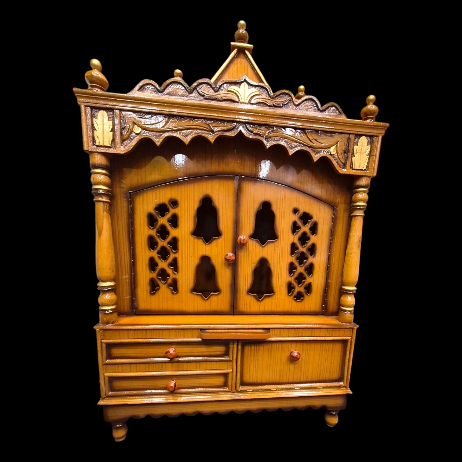 This pooja mandir offers a harmonious blend of traditional design elements and contemporary sensibilities. While paying homage to age-old customs, the mandir incorporates modern features that make it practical and convenient for everyday use. Whether you have a modern or traditional home, this wooden pooja mandir will seamlessly integrate into your decor, creating a serene and inviting atmosphere. Embrace the divine with a beautifully designed wooden temple for your home, enhanced with golden details and glass for an elegant touch.