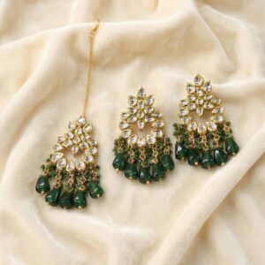 Maang Tikka Earrings Set | Kundan Stone Work | Gold Plated Jewelry | Green